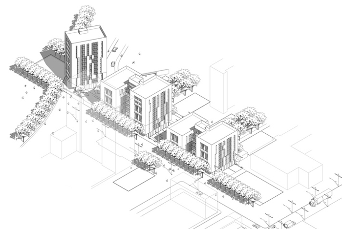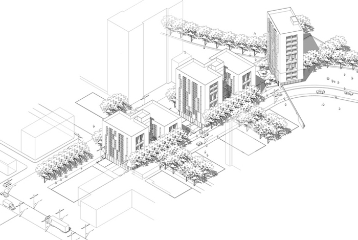 L’objectif du projet est donc de donner les parcours qualifiables en réaménageant une partie du quartier de la Ville Nouvelle pour une ville « plurielle ». Sur un axe clair, le projet se compose d’une série de 5 bâtiments alignés avec 4 emplacements pour les projets à venir, en créant le lien propose et visible depuis la place Maréchal Juin de l’avenue de l’Europe jusqu’au château d’eau (les trois tours) de l’interstice.
