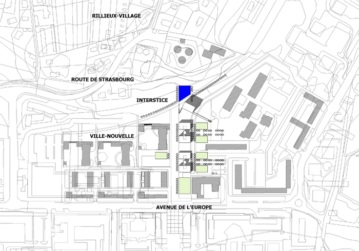 Le quartier de la Ville Nouvelle se situe au sud de Rillieux-Village, un quartier pavillonnaire. Entre ces deux quartiers de morphologie très différente se trouve un interstice comme une zone d’amortissement. La relation géographique entre ces deux quartiers est difficilement trouvable ; il y a donc trois axes parallèles, la route de Strasbourg de Rillieux-Village, l’interstice et l’avenue de l’Europe de la Ville Nouvelle, qui ne se croisent pas et qui ne donnent pas les parcours poreux entre eux.