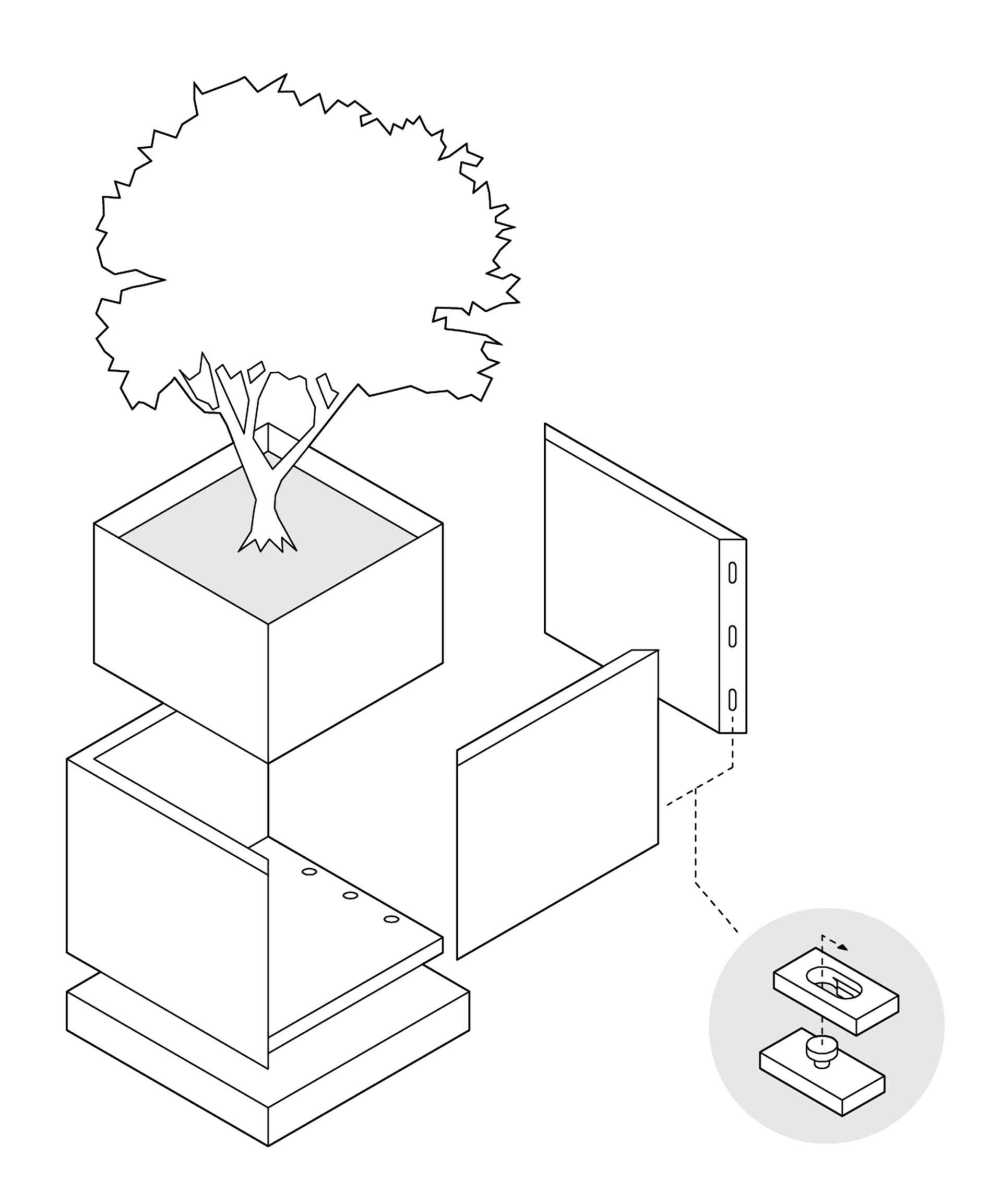 UN OBJET peut transformer un espace vide en un lieu de communication. De couleur vive et à l’ombre d’un grand arbre, ce mobilier urbain est à la fois un point de repère et un petit pavillon où les gens se retrouvent et communiquent. Il se monte facilement sans outils spéciaux à partir d’éléments préfabriqués ; il suffit ensuite de coller le film d’étanchéité, de le remplir de terre, d’y planter un aulne de taille moyenne, et il est prêt à l’emploi.
