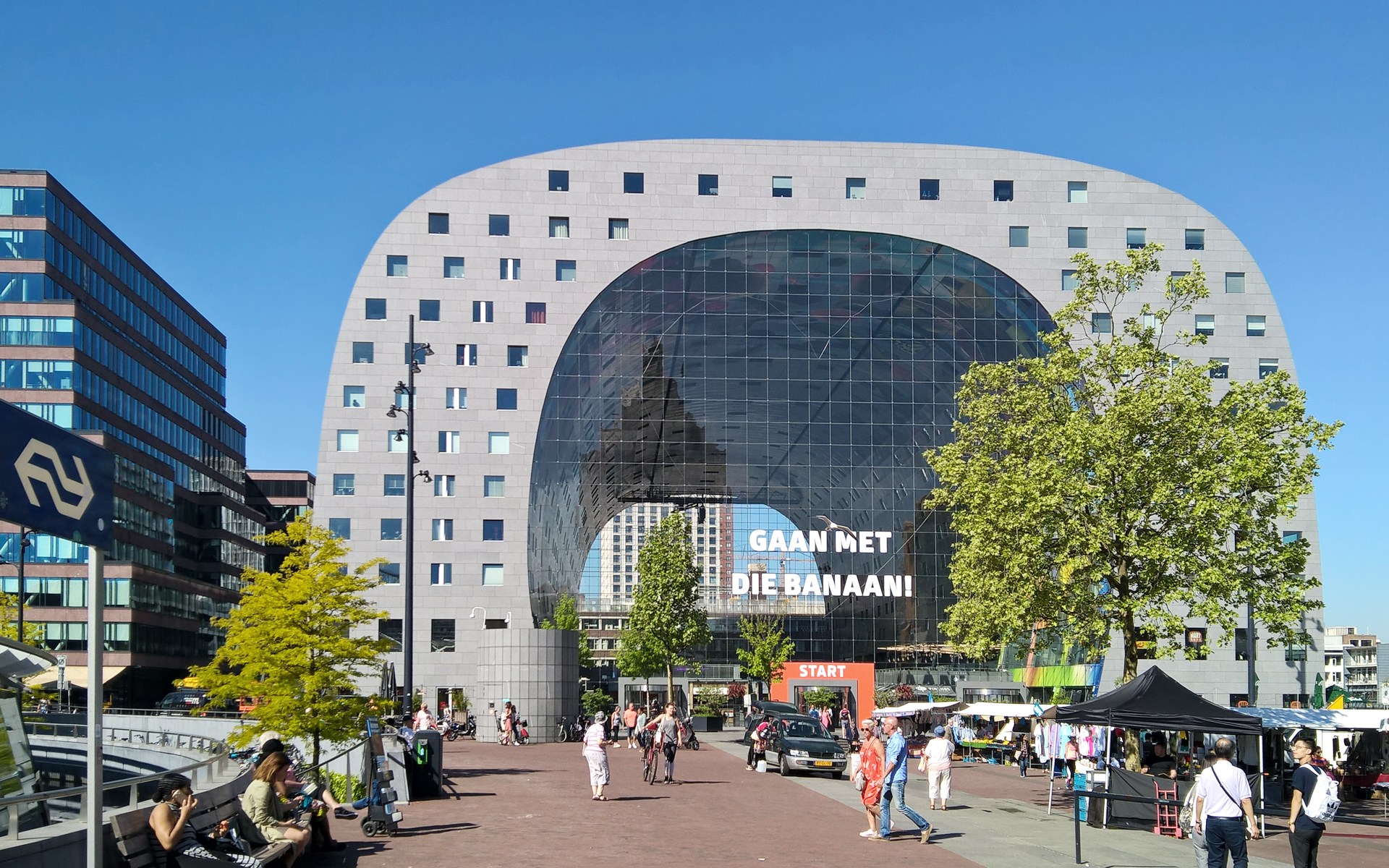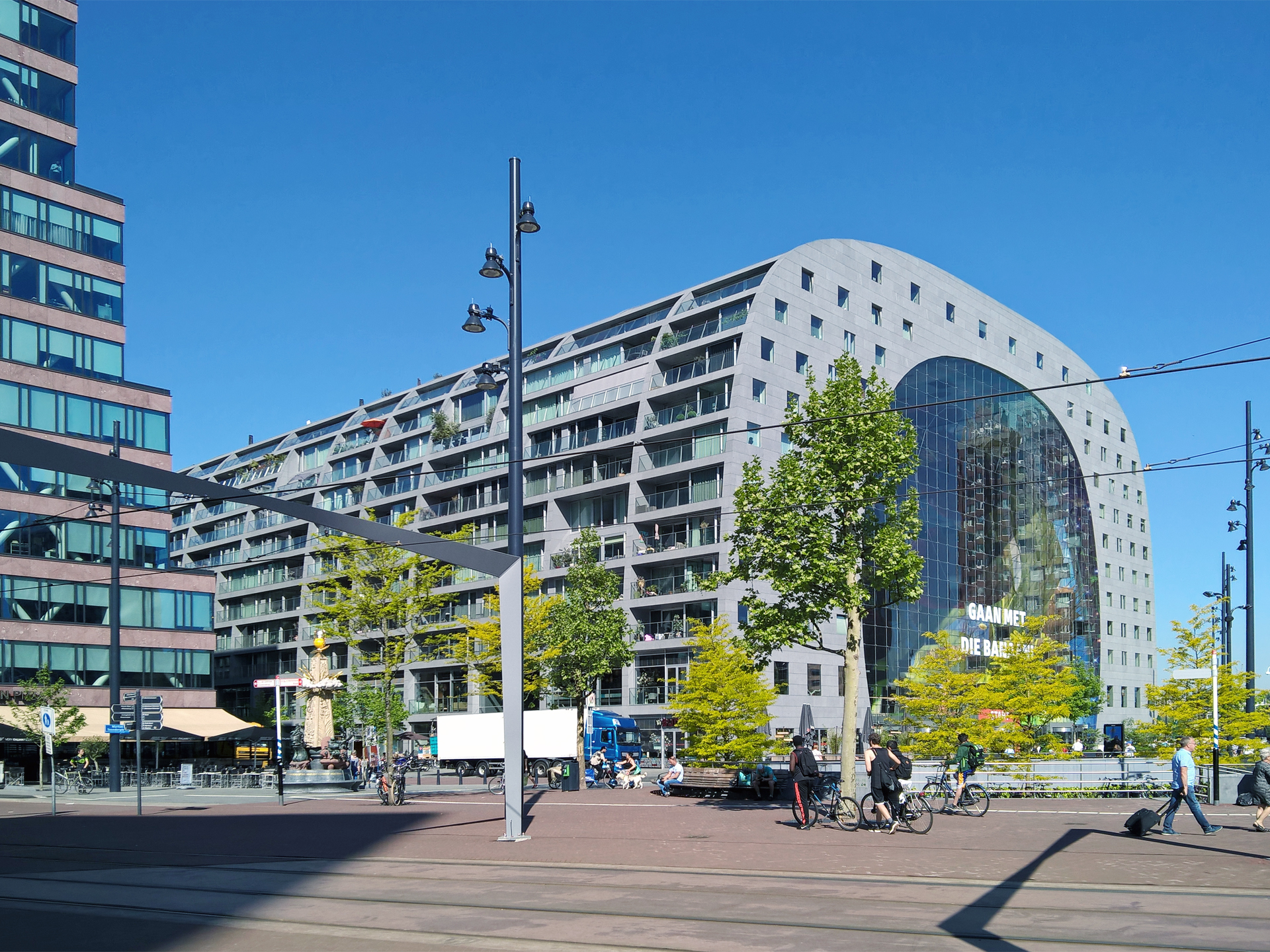 Rotterdam est une ville de l’architecture dans son excellence esthétique au-delà de la faisabilité pratique ; le Markthal, une combinaison de logements collectifs et de marché couvert construit en 2014 au centre de la ville, serait un bon exemple pour observer une réinvention néerlandaise des idées architecturales. J’y suis allé pour acheter des stroopwafel frais, un classique néerlandais, et le bâtiment était étonnant. En effet, sa structure en forme d’arc, qui ressemble à une sorte de couverture de wagon dans les films de western, provient de deux entités d’habitation qui partagent un toit ; les murs de pignon des entités d’habitation constituent les entrées du marché traversant. Cela a l’air simple, mais l’architecte a surmonté plusieurs défis techniques, par exemple :
